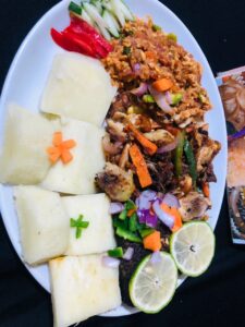 A choice of sauce drizzled chicken, beef, pork, or goat kebabs – with seasoned yam,…
