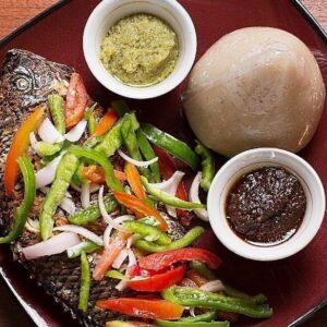 Seasoned roasted fish of the day, served with sautéed vegetables, coconut rice, and hot sauce